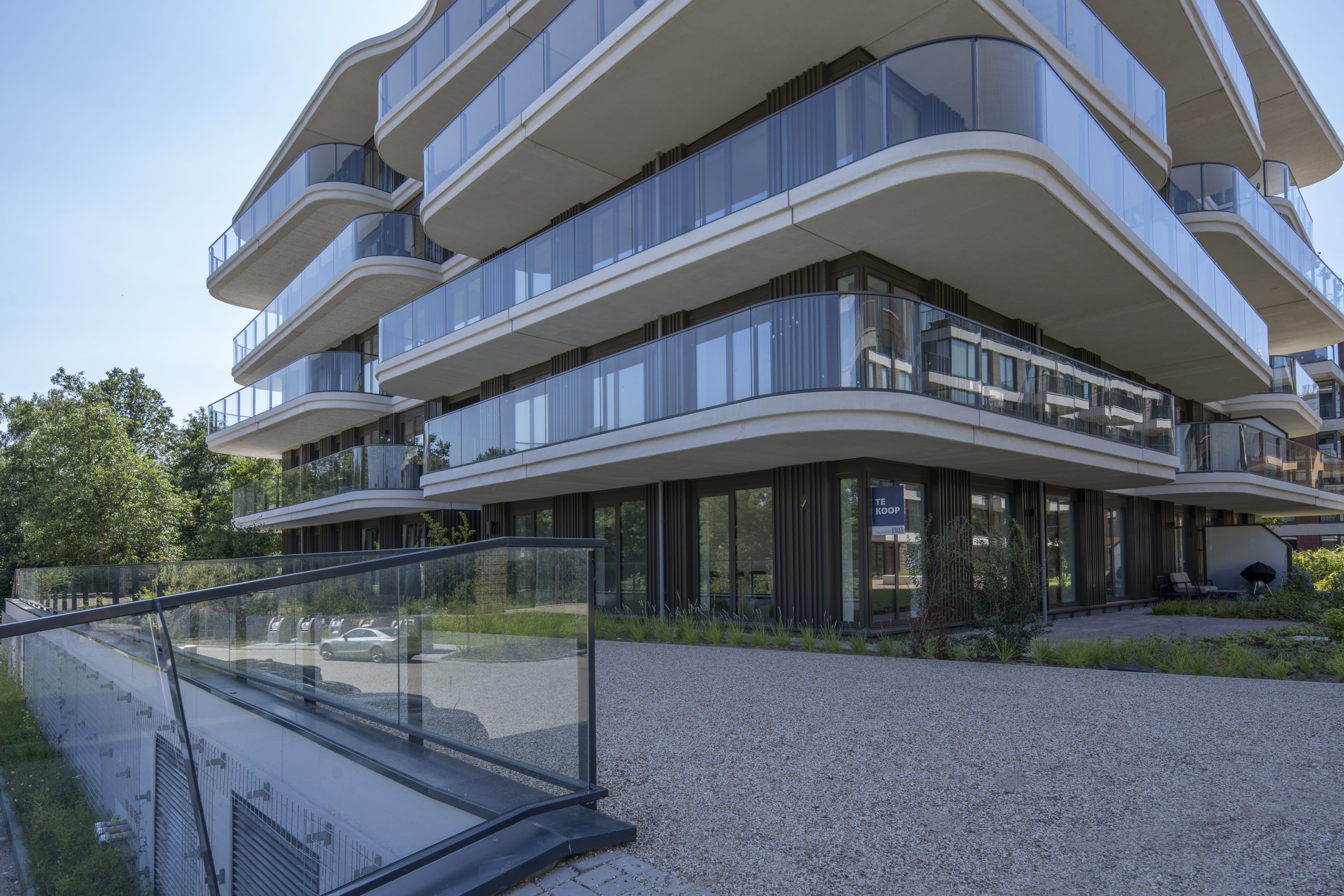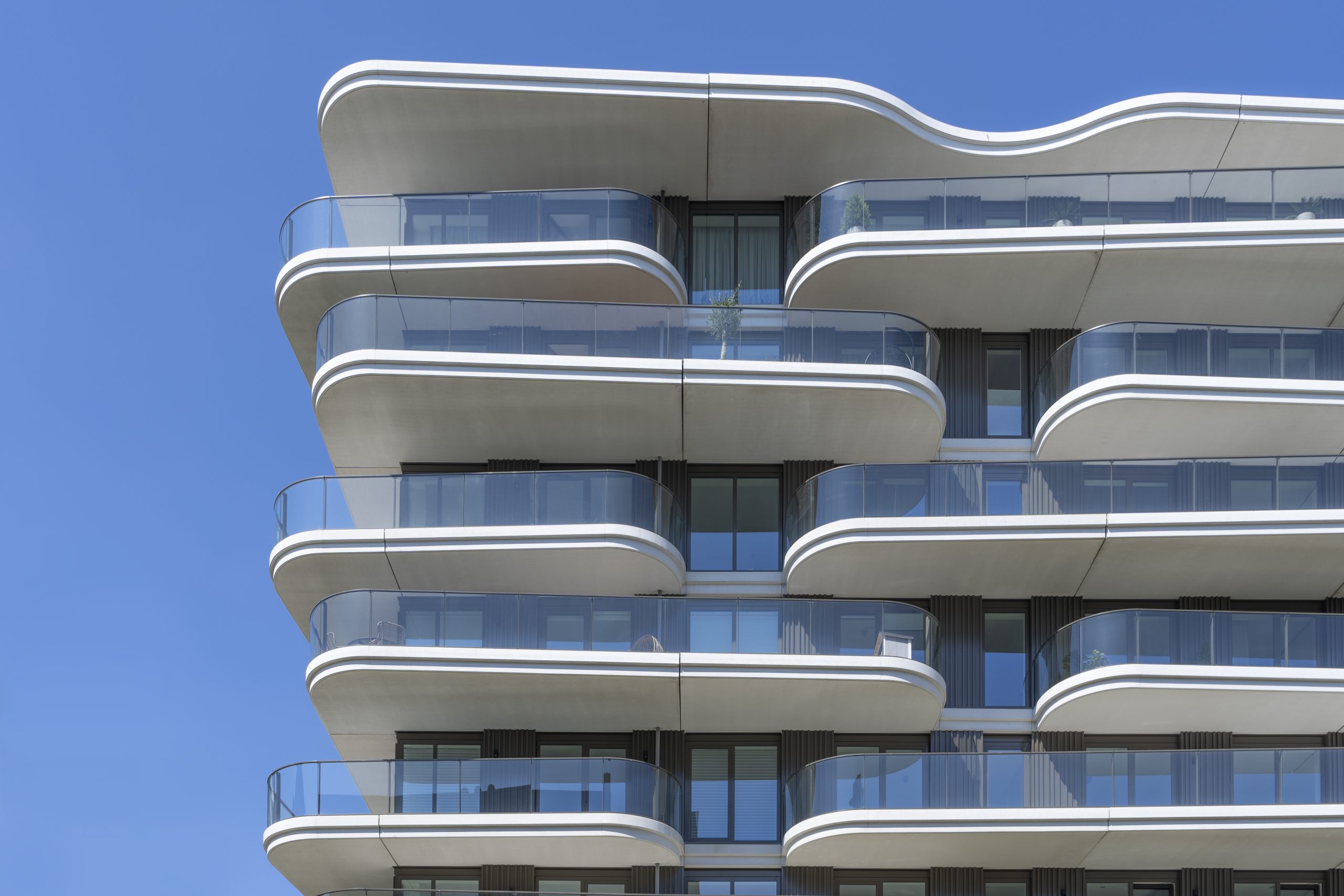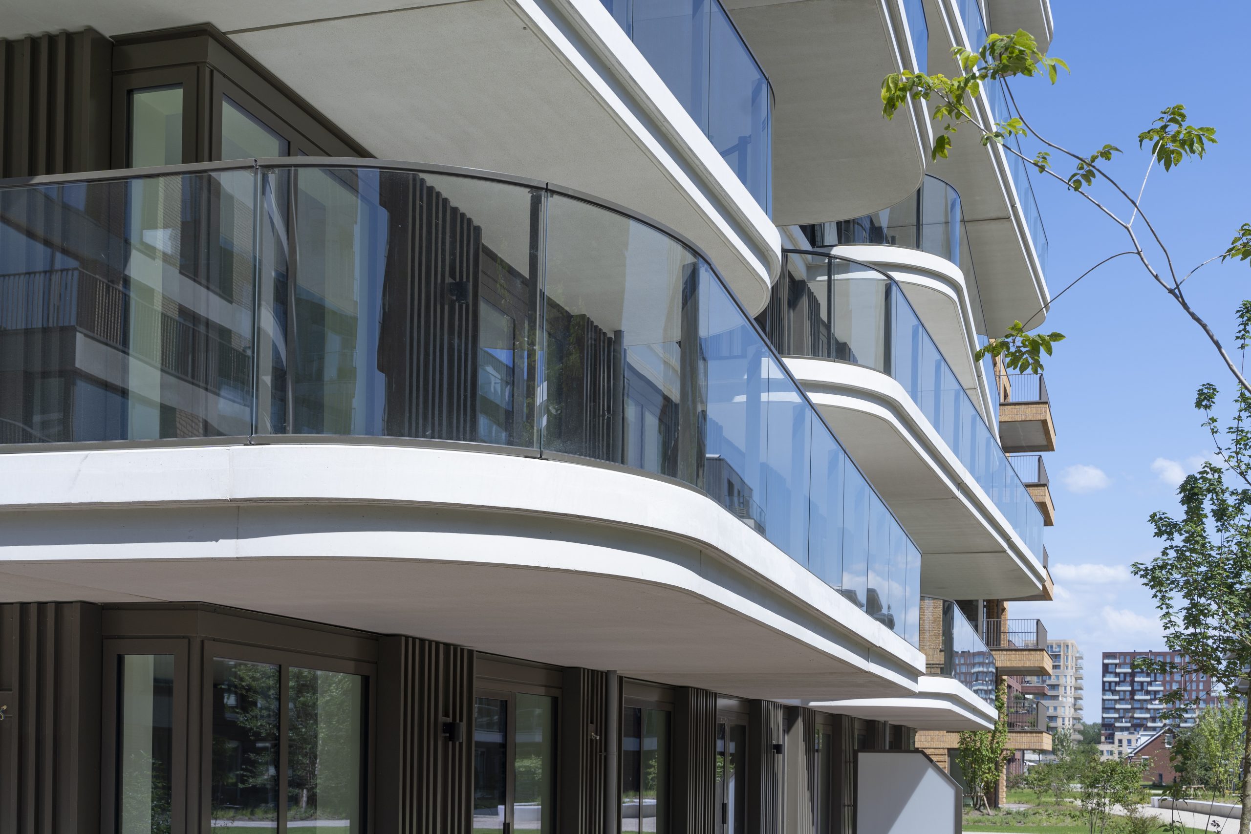 Bij het Olympiade-project in Amstelveen hebben wij het hekwerk op de balkons verzorgd, dat een mooie toevoeging is aan de sculpturale en afgeronde vormen van de urban villa’s. Deze balkons, uitgevoerd in wit beton met glazen hekwerk, creëren een speels contrast met de overige gebouwen. De schuine vormen en verspringingen in de balkononderbreking zorgen voor een dynamisch aanzicht, en ons hekwerk versterkt deze esthetiek perfect.