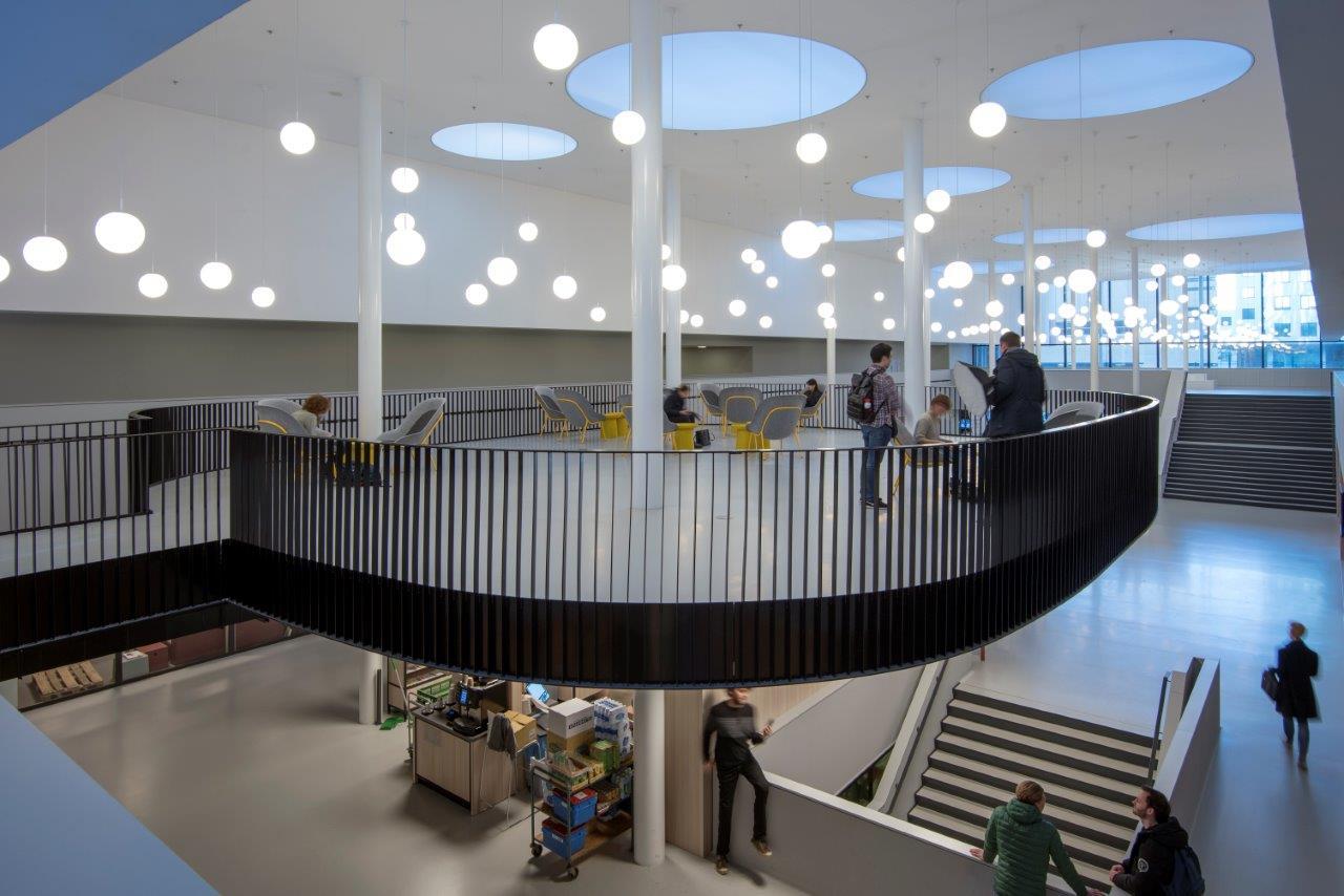 The University of Amsterdam explores large-scale reinvention. Two utilitarian buildings from a previous era – part of an incomplete masterplan by Norbert Gawronski – are stripped out, sliced open, reconfigured and then knitted back into the city’s fabric to regenerate a post-war university campus in the heart of the Dutch capital. A forty-metre section of low-hung, canal-spanning building is cut out and replaced with a four-storey void. Physically and visually opening up the campus behind and the zoo beyond, the void is bridged by a glazed double-height space and five storeys of workstations, all with new views across the city. A previously solid wall is punched through to create entry into a new triple-height passage connecting the two principal blocks of accommodation; this passage permits the building’s users to gather and orientate themselves while efficiently distributing faculty members to the vertical circulation cores Outside, a new pedestrian bridge draws into play the city’s canal-scape, the neighbourhood streetscape and the campus’ half-realised secondary axis. Inspired by Amsterdam’s historic canals, the bridge connects to a series of public rooms and commercial spaces that activate and open the buildings’ edges. Internally, elements have been removed to accommodate the university’s relocated Amsterdam Law School and the Faculty of Social & Behavioural Sciences by providing seven lecture theatres, seven seminar rooms, 86 tutorial rooms, a Law Library, a Moot Court, research offices, meeting areas, study landscapes, breakout areas, a roof terrace, 1,700 square metres of catering environments and 2,260 square metres of ground floor public gathering space.