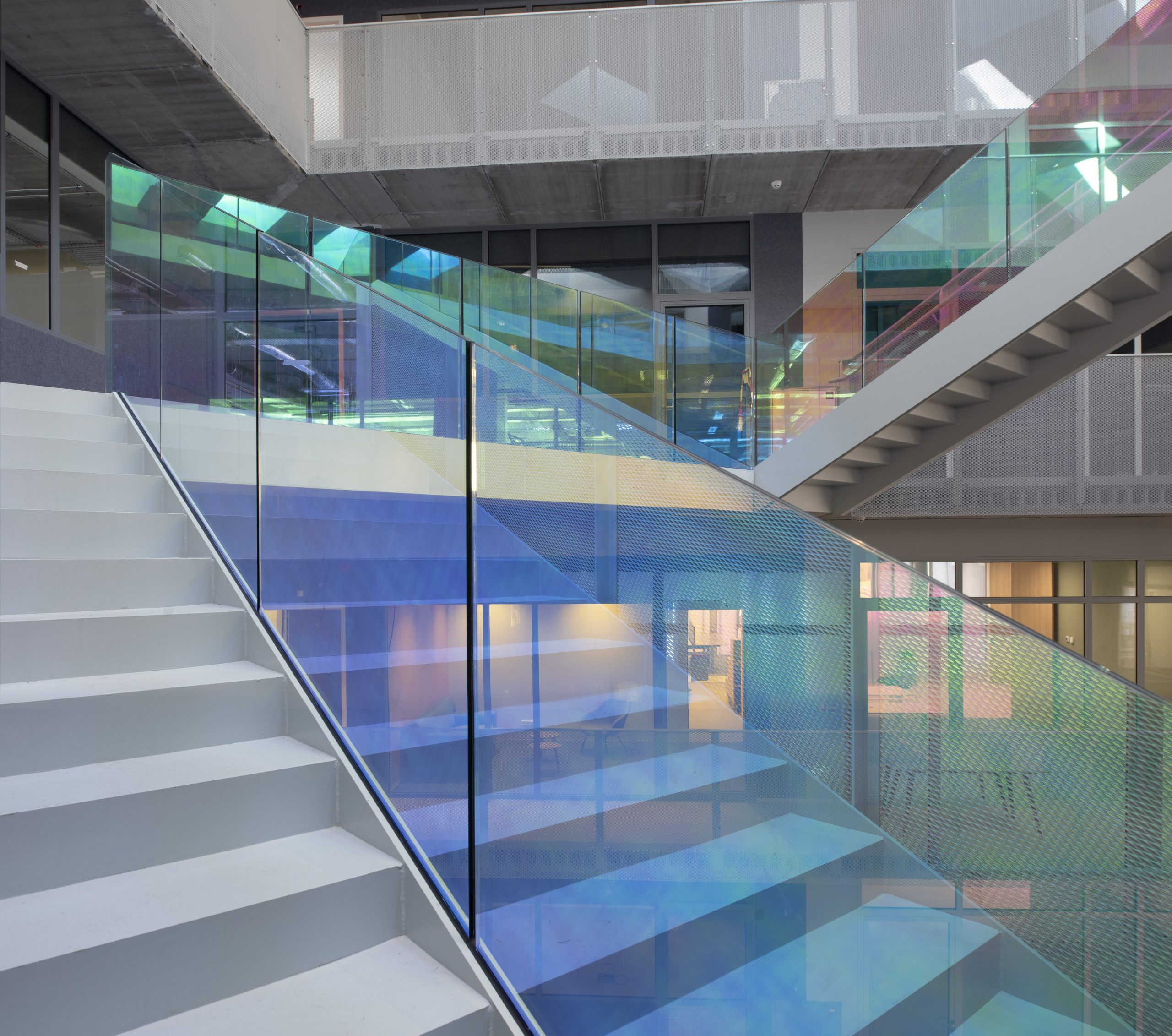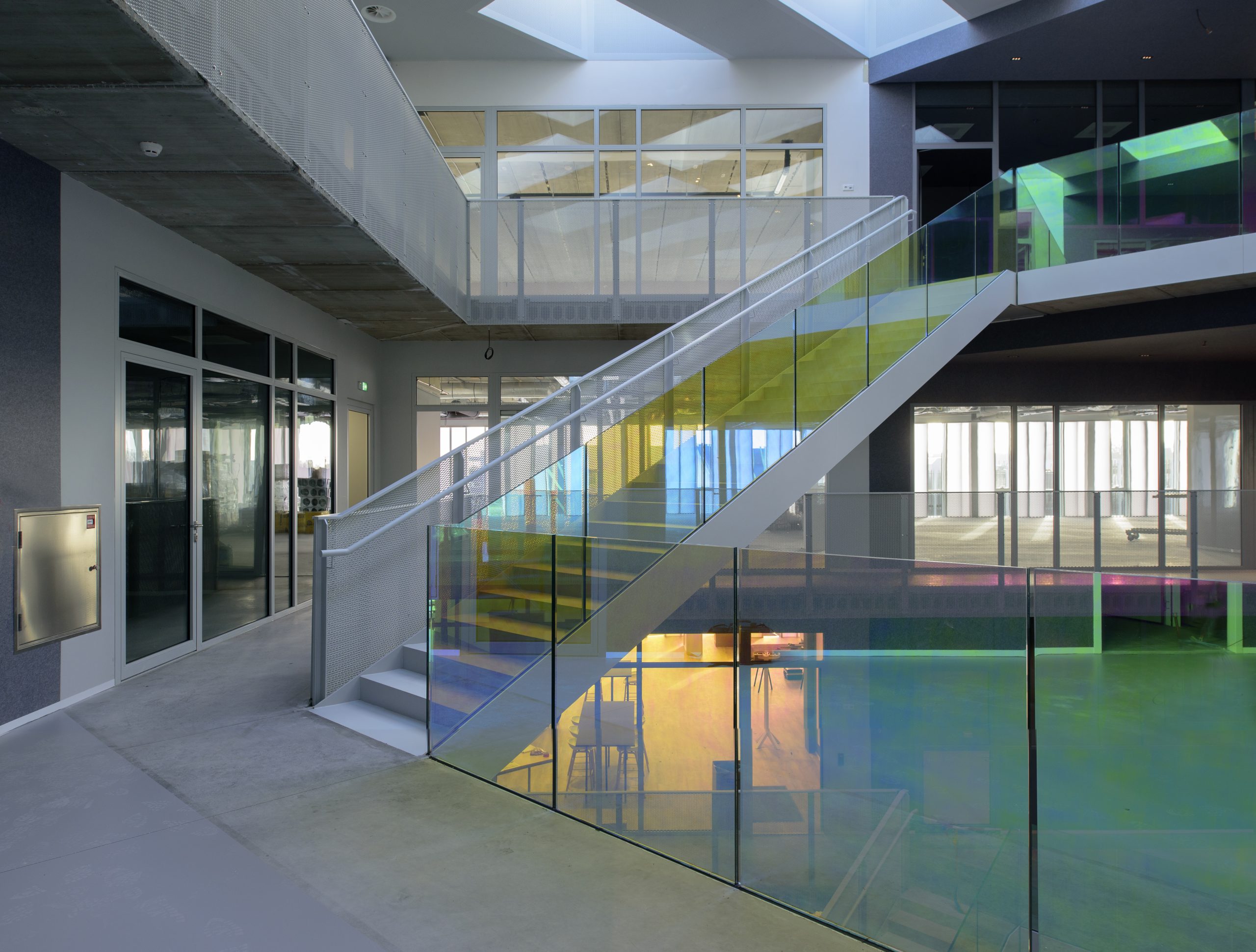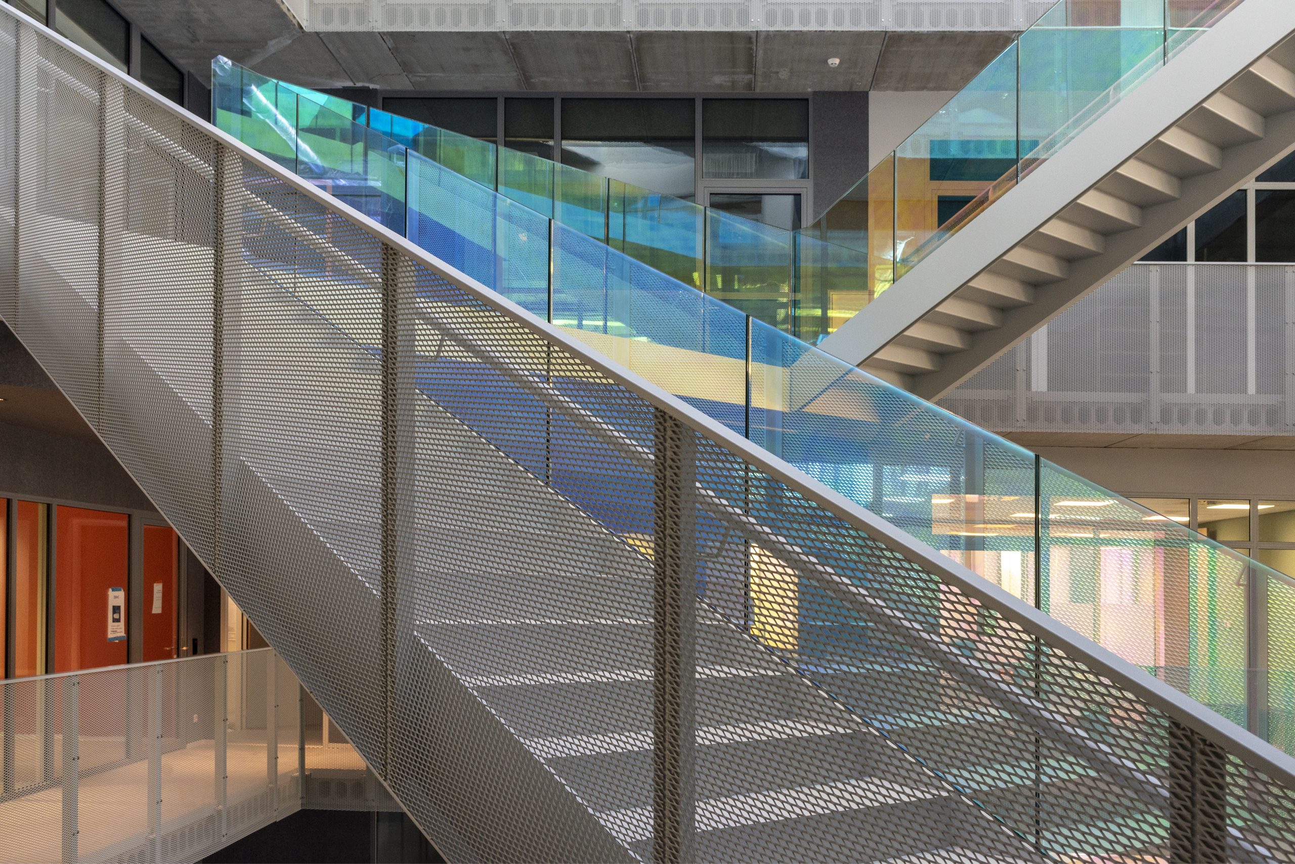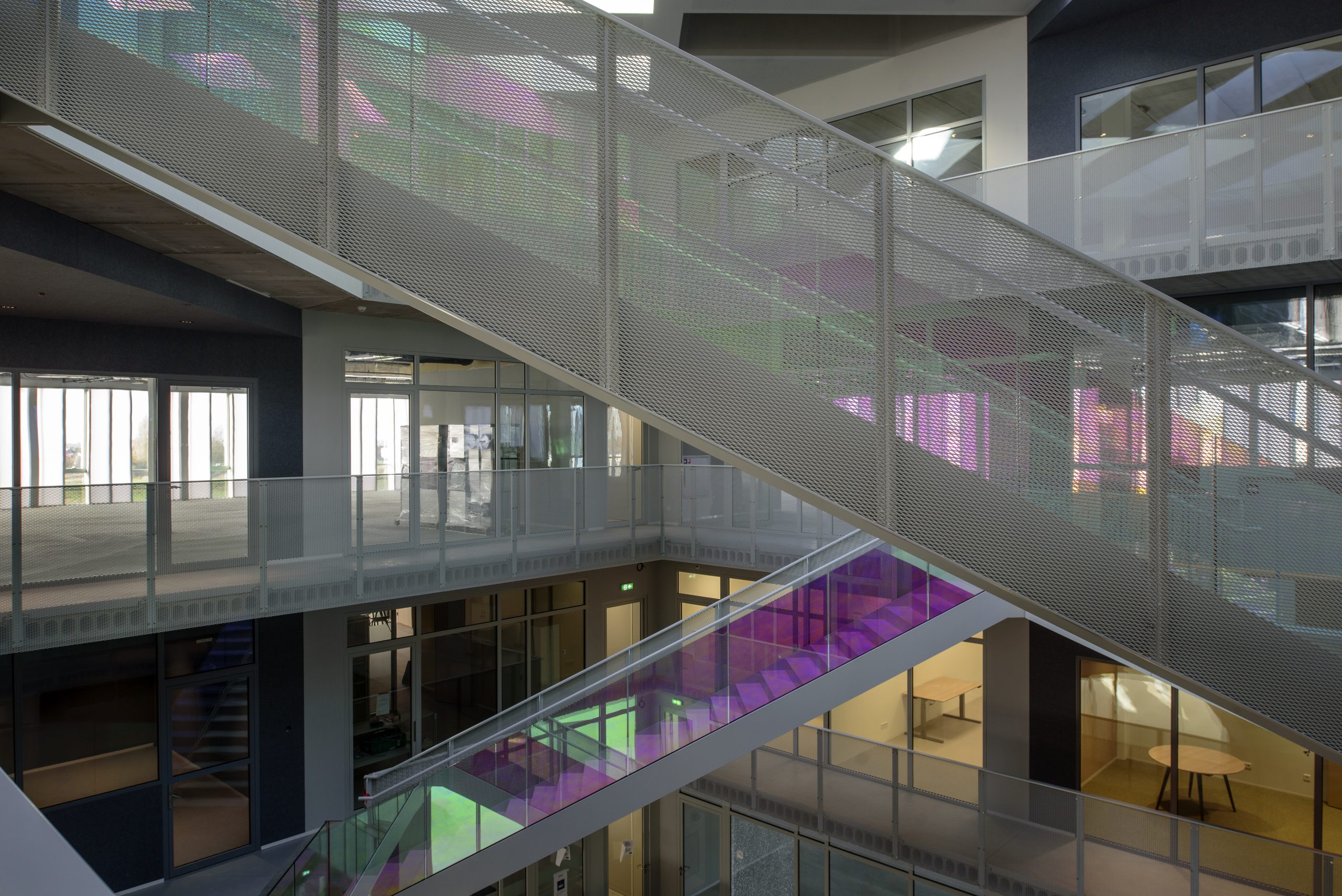 In het atrium bevindt zich een glazen trap die in het midden omhoog gaat. Dit centraal glazentraphekwerk laat daglicht vrij door het atrium stromen en creëert een gevoel van openheid en ruimte. Verder hebben we de binnenkozijnen mogen verzorgen bij het ultra plus gebouw.