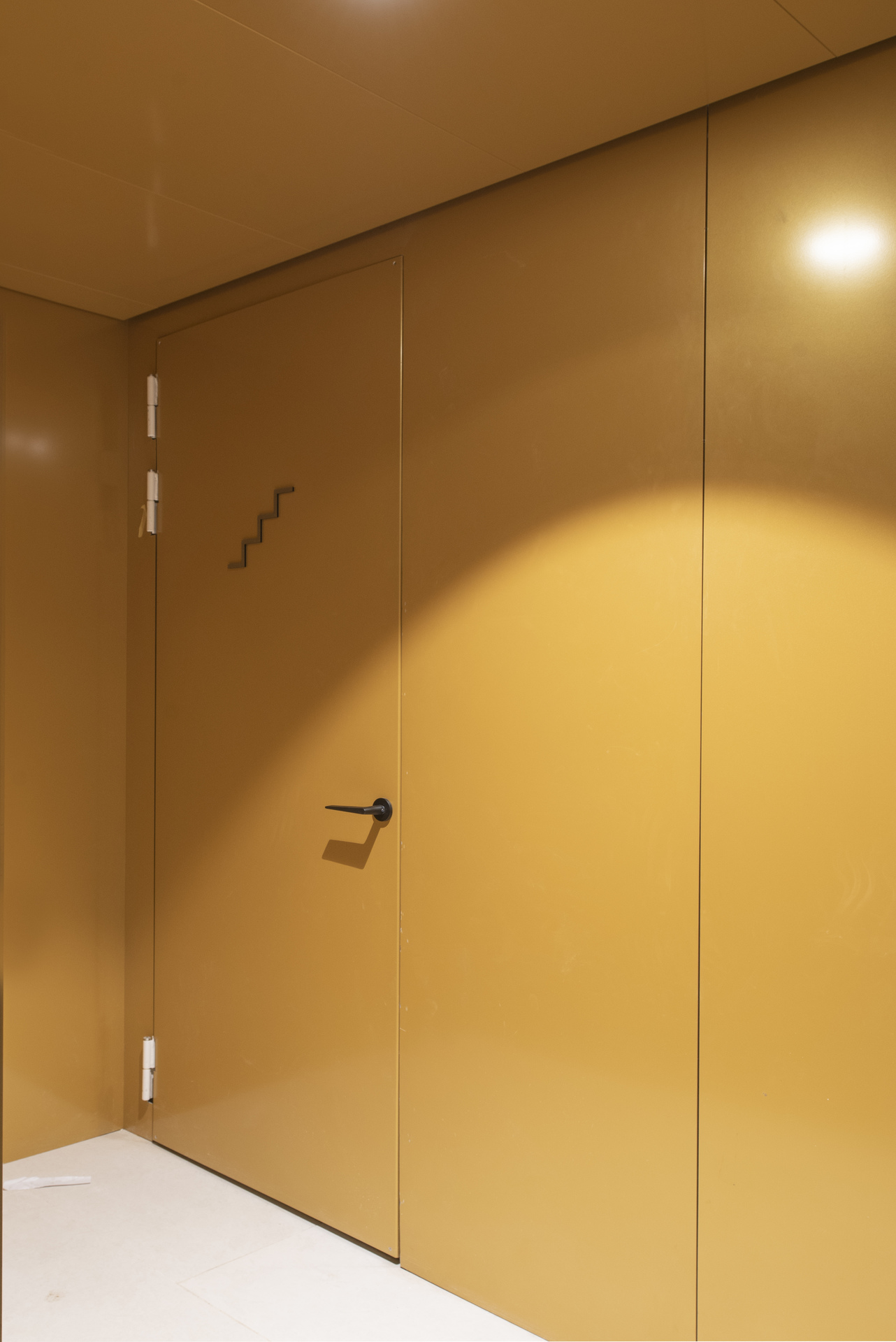The Muse, want inspirerend was het zeker. De unieke opbouw van het gebouw, de prachtige witte balkons voorzien van balusterloos glashekwerk en het bijna ‘gouden’ kamertje. Omringt met postvakjes kijkt u naar de aluminium beplating die niet alleen gecombineerd wordt met onze stalen deuren, maar ook met de muren! Tot slot hebben we ook nog lamellenhekwerk geplaatst en een stalen trap.